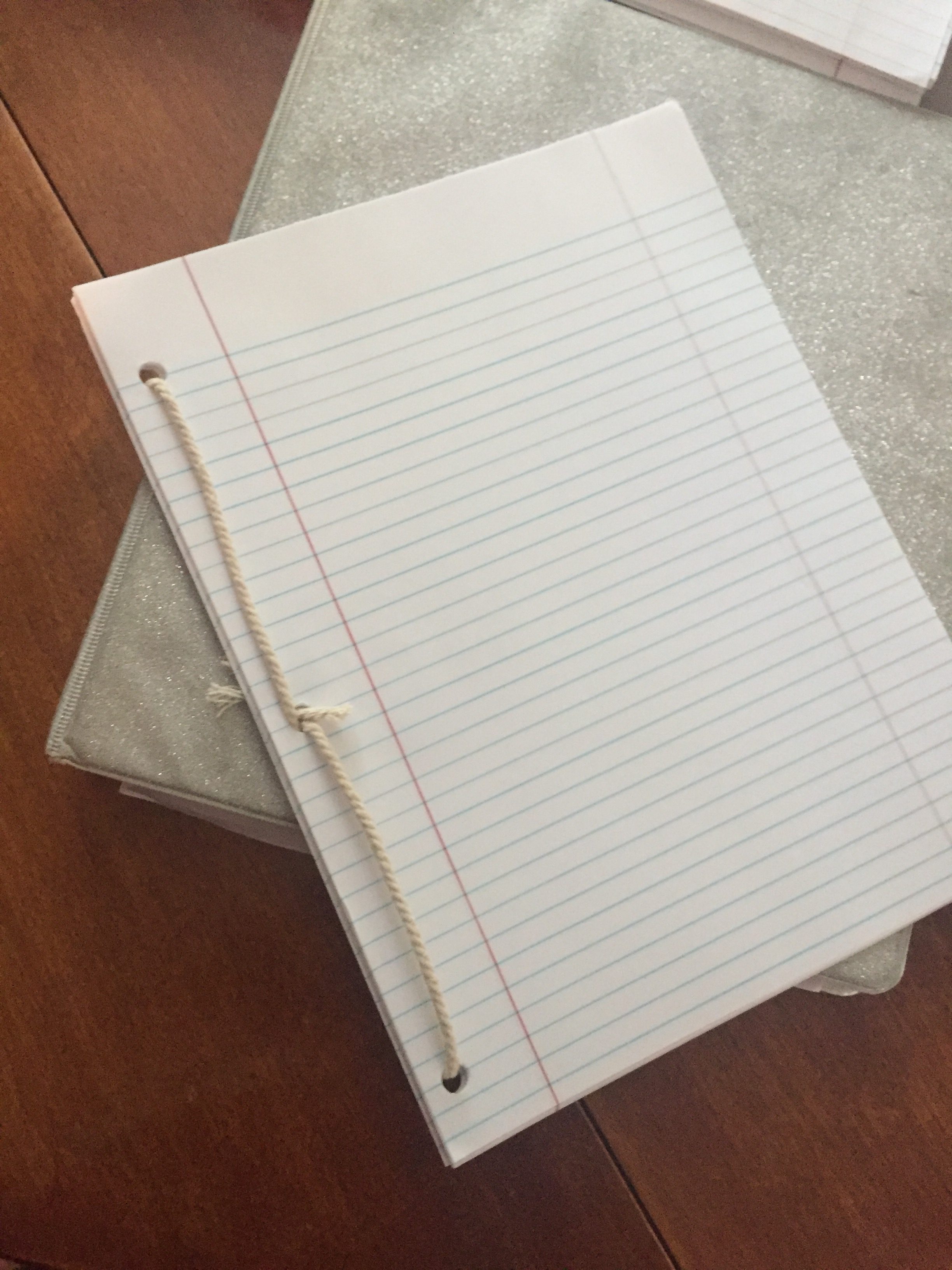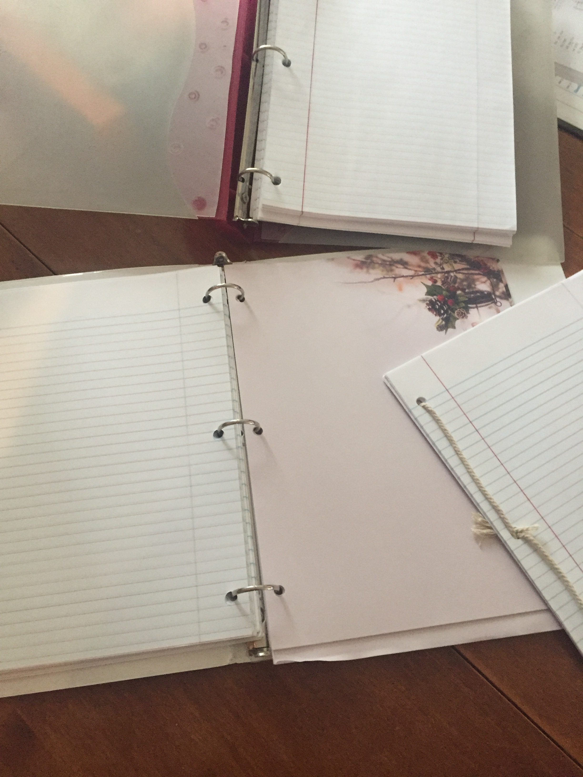 Sure enough, I opened up the binders and there was the Christmas paper she punched out as well as all the extra loose leaf paper we had in the house. She had used all of Kendall’s old binders, then made her own binding by taking string and lacing it through the paper holes.