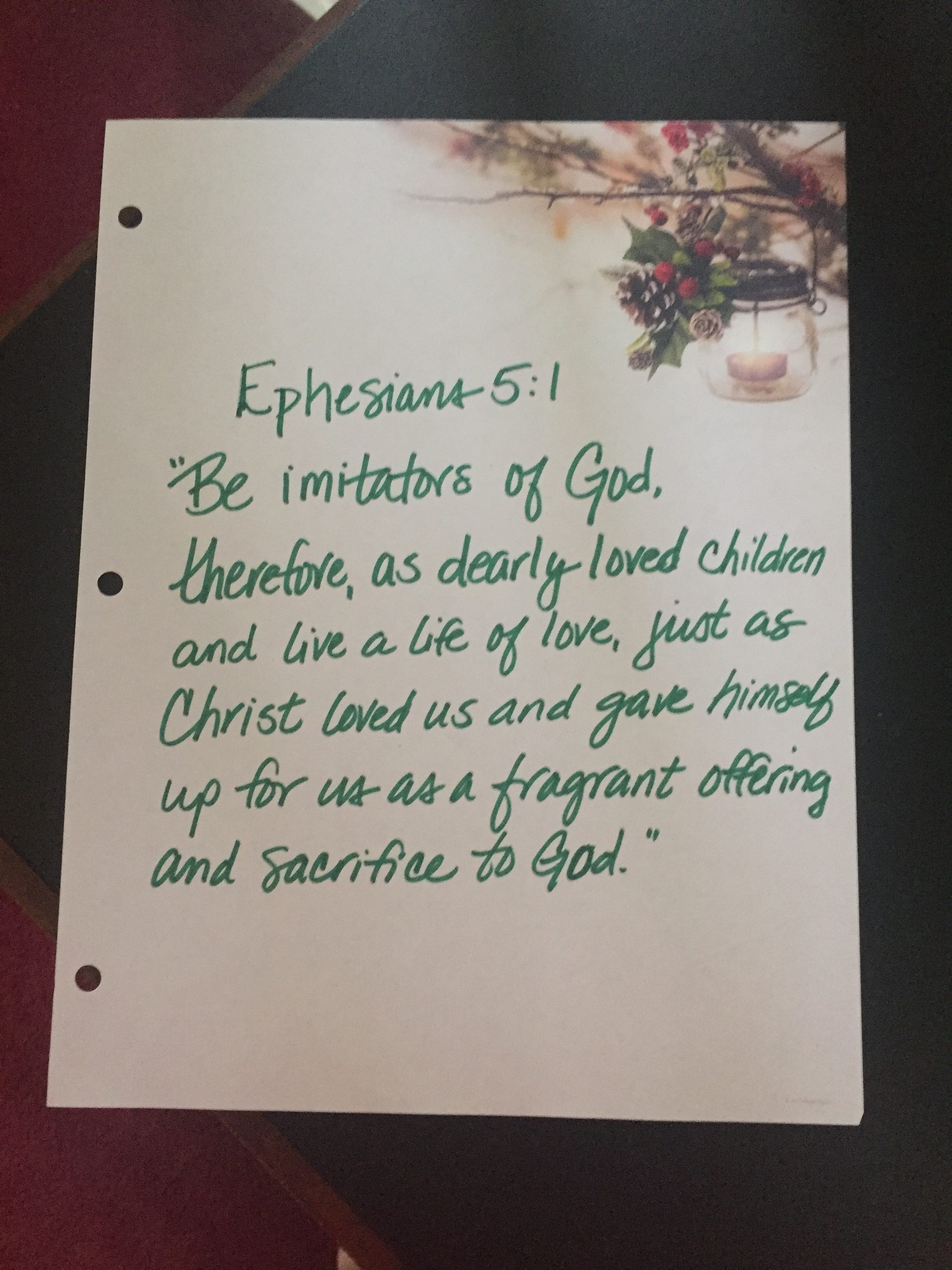 It makes me think of Ephesians 5:1, “Be imitators of God, therefore, as dearly loved children and live a life of love, just as Christ loved us and gave himself up for us as a fragrant offering and sacrifice to God.”