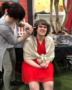 Then Sarah went to the make-up table. Bless Emily, the make-up artist, for trying to put make-up on Sarah! Sarah put her head down or squinted her eyes tightly. Emily was so patient with her. At the end, Sarah was very pleased with the final product! It was so cute!