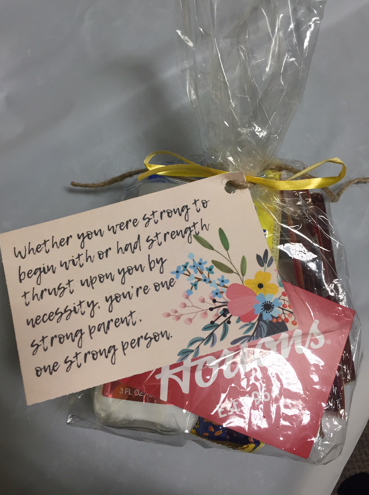 The note on the goodie bag reads: “Whether you were strong to begin with or had strength thrust upon you by necessity. You’re one strong parent. One strong person.” ❤